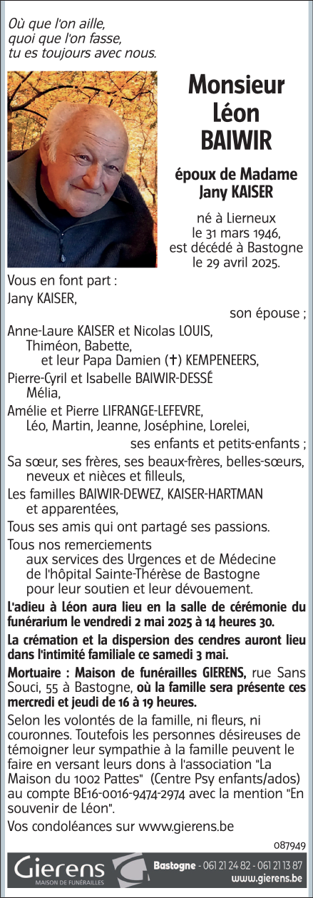 Décédé à Bastogne (6600) le mardi 29 avril 2025 à l'âge de 79 ans