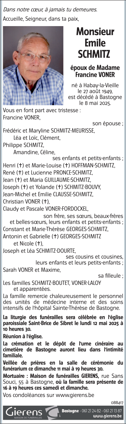 Décédé à Bastogne (6600) le jeudi 8 mai 2025 à l'âge de 75 ans