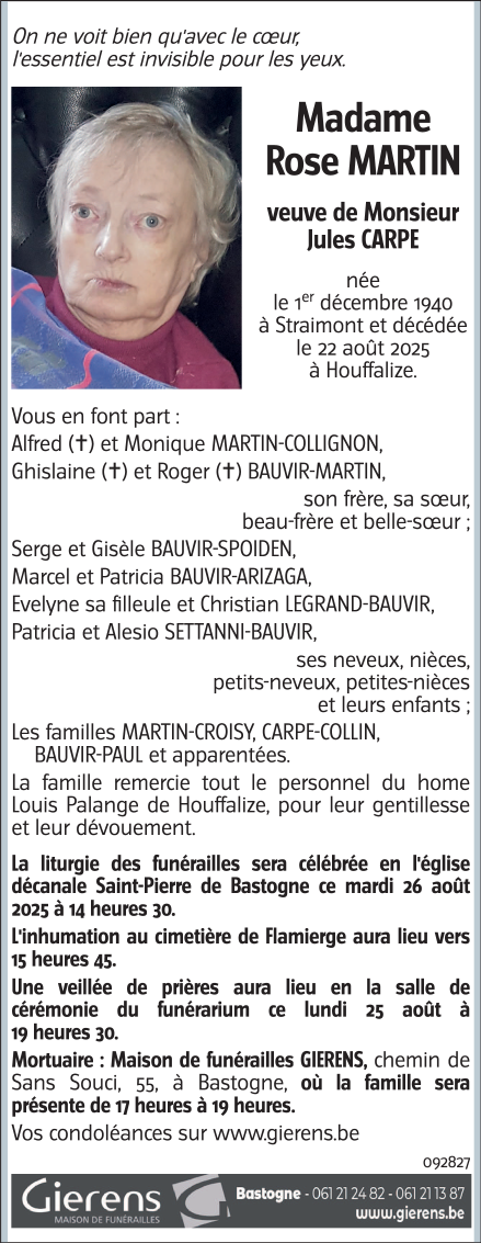 Décédée à Houffalize (6660) le vendredi 22 août 2025 à l'âge de 84 ans