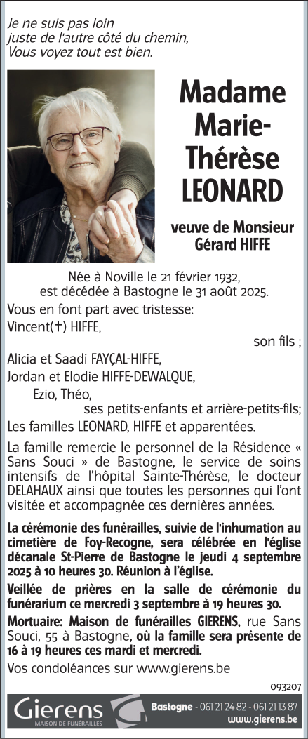 Décédée à Bastogne (6600) le dimanche 31 août 2025 à l'âge de 93 ans