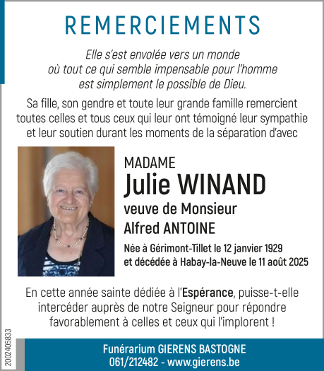 Décédée à Habay (6720) le lundi 11 août 2025 à l'âge de 96 ans