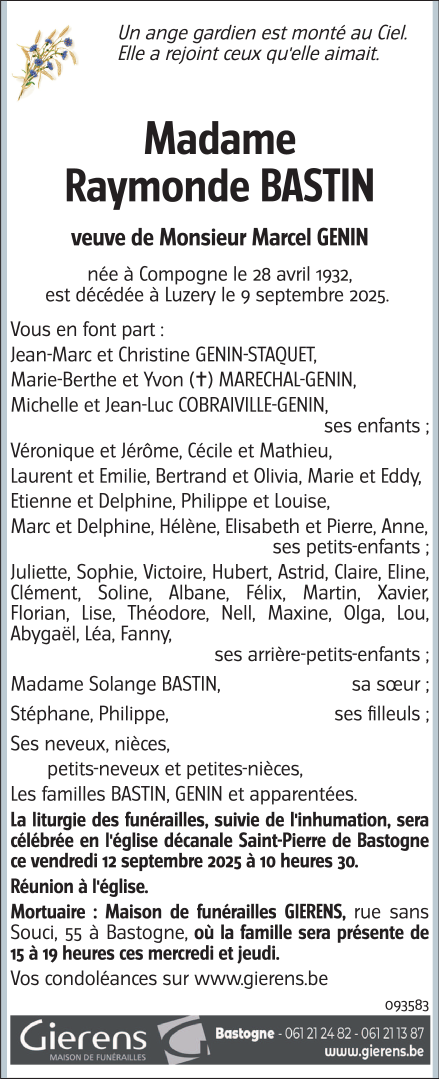 Décédée à Bastogne (6600) le mardi 9 septembre 2025 à l'âge de 93 ans