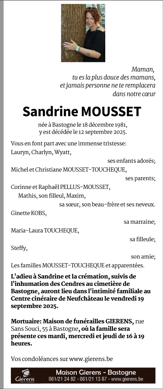 Décédée à Bastogne (6600) le vendredi 12 septembre 2025 à l'âge de 43 ans