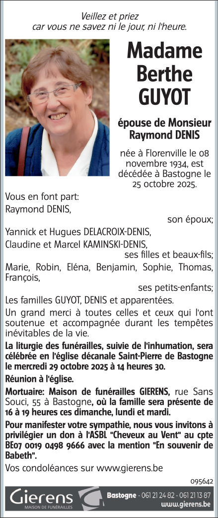 Décédée à Bastogne (6600) le samedi 25 octobre 2025 à l'âge de 90 ans