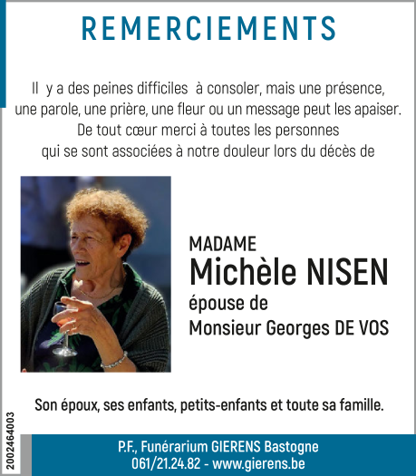 Décédée à Bastogne (6600) le samedi 18 octobre 2025 à l'âge de 69 ans