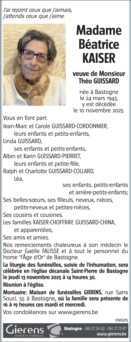 Décédée à Bastogne (6600) le lundi 10 novembre 2025 à l'âge de 82 ans