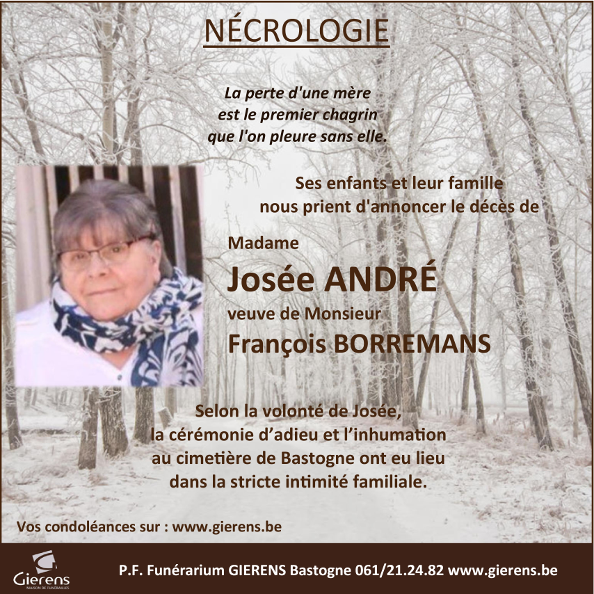 Décédée à Bastogne (6600) le mardi 18 novembre 2025 à l'âge de 83 ans
