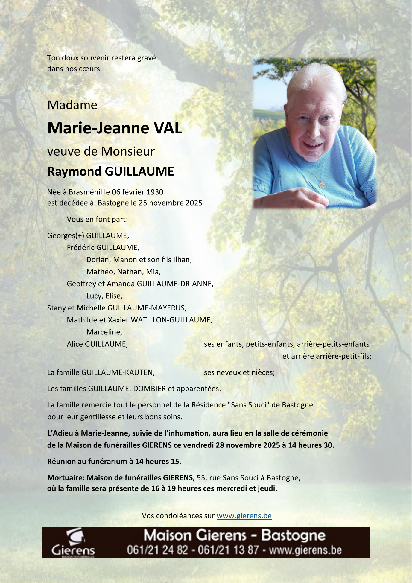 Décédée à Bastogne (6600) le mardi 25 novembre 2025 à l'âge de 95 ans