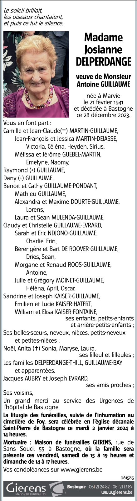Décédée à Bastogne (6600) le jeudi 28 décembre 2023 à l'âge de 82 ans