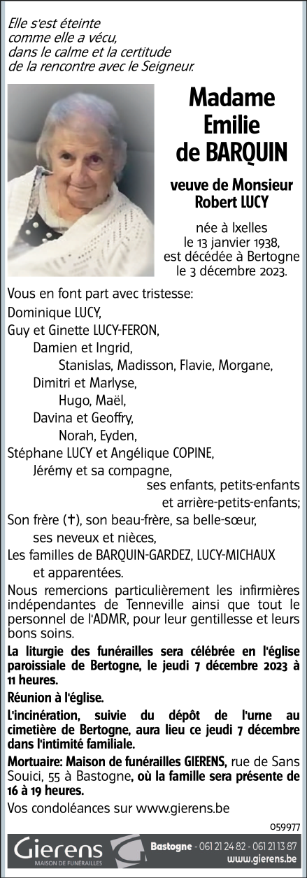 Décédée à Bertogne (6687) le dimanche 3 décembre 2023 à l'âge de 85 ans