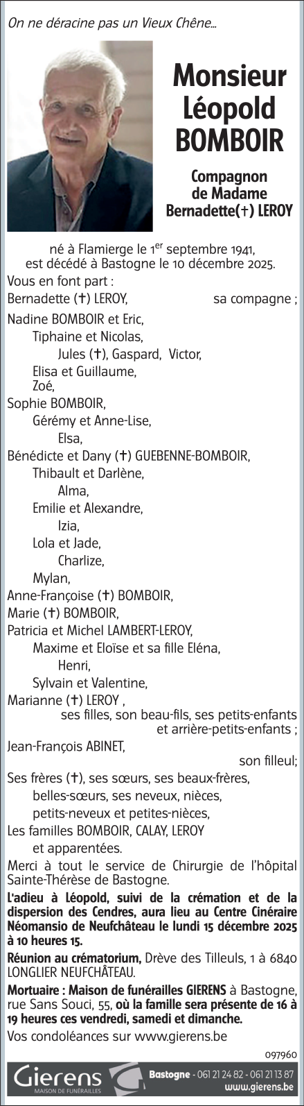 Décédé à Bastogne (6600) le mercredi 10 décembre 2025 à l'âge de 84 ans