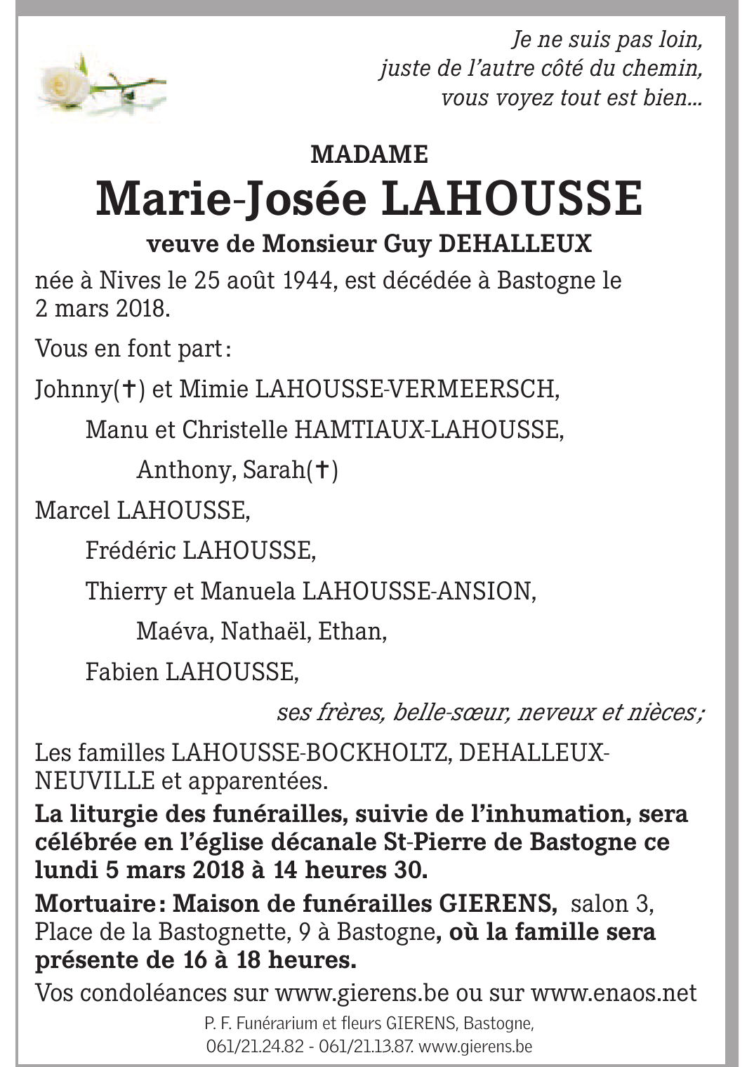 Décédée à Bastogne (6600) le vendredi 2 mars 2018 à l'âge de 73 ans
