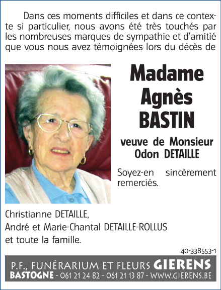Décédée à Bastogne (6600) le vendredi 1 mai 2020 à l'âge de 92 ans