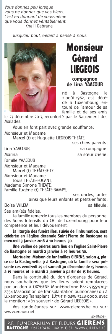 Décédé à Luxembourg/Barble (1210, Luxembourg) le mercredi 27 décembre 2017 à l'âge de 55 ans