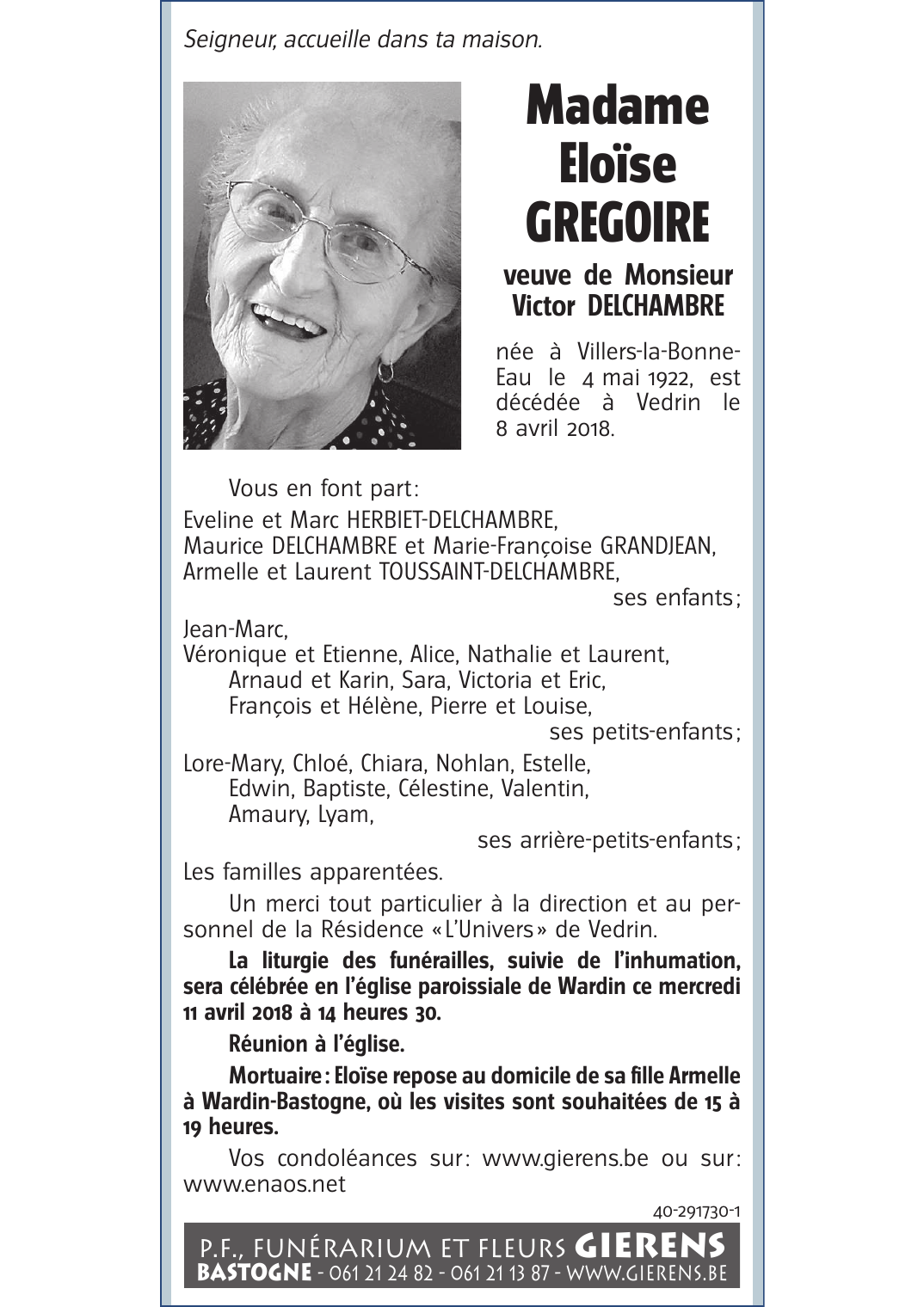 Décédée à Vedrin (5020) le dimanche 8 avril 2018 à l'âge de 95 ans