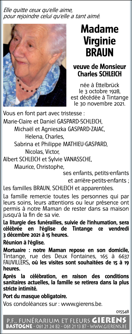Décédée à Fauvillers (6637) le mardi 30 novembre 2021 à l'âge de 93 ans