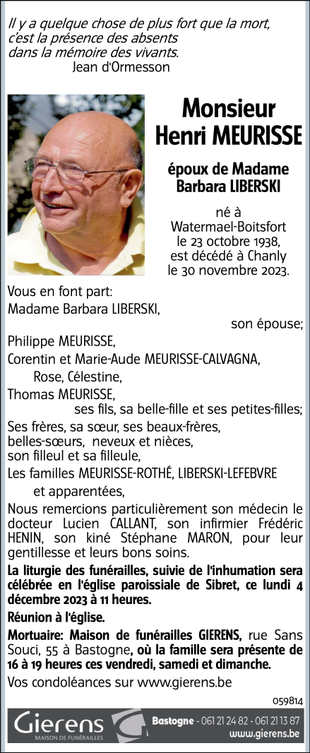 Décédé à Chanly (6921) le jeudi 30 novembre 2023 à l'âge de 85 ans
