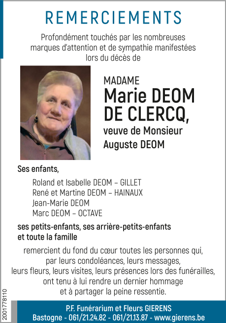 Décédée à Bastogne (6600) le samedi 16 décembre 2023 à l'âge de 88 ans