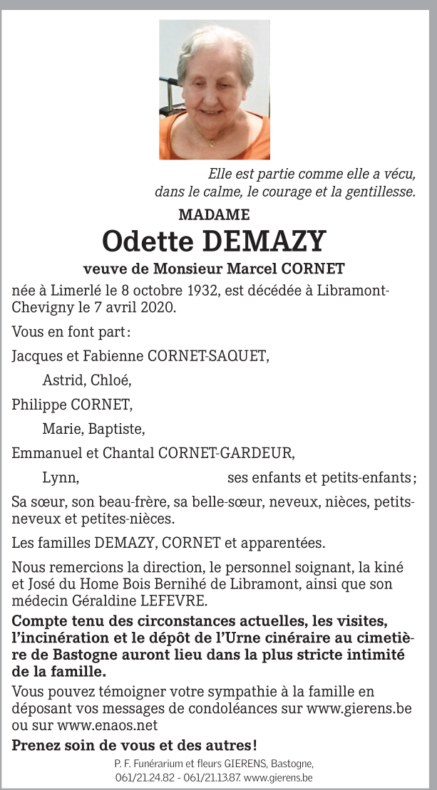 Décédée à Libramont-Chevigny (6800) le mardi 7 avril 2020 à l'âge de 87 ans