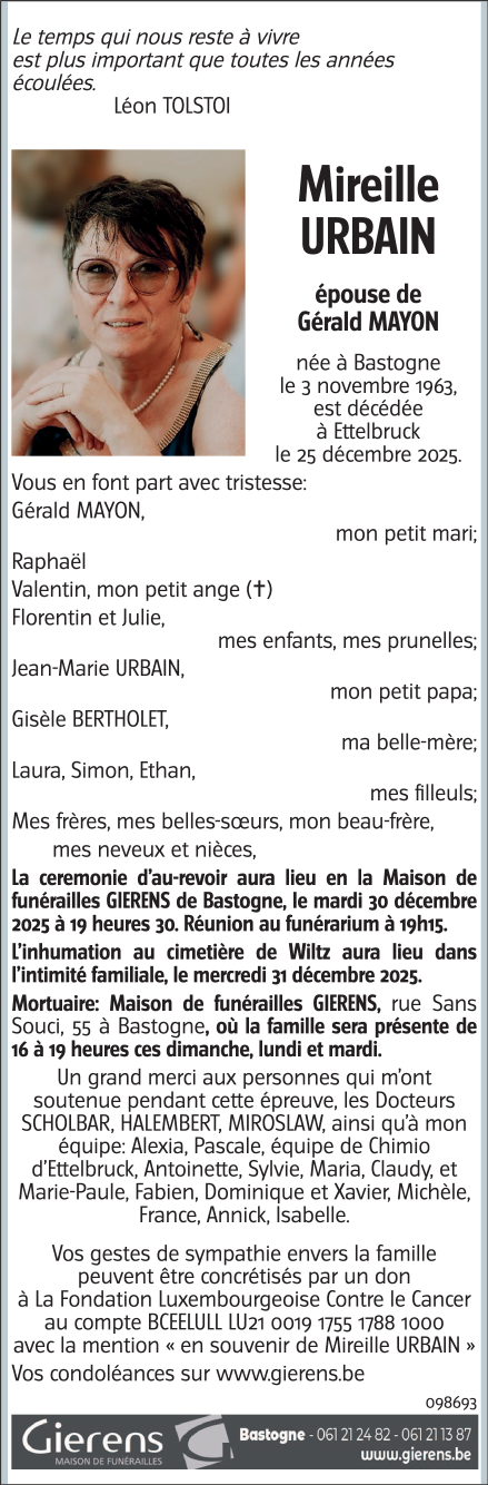 Décédée à Ettelbruck/Salentiny  (9080, Luxembourg) le jeudi 25 décembre 2025 à l'âge de 62 ans