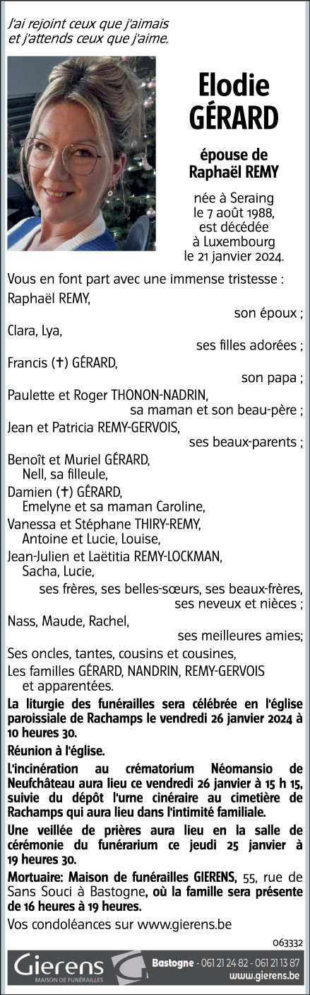 Décédée à Luxembourg/Anvers  (1130, Luxembourg) le dimanche 21 janvier 2024 à l'âge de 35 ans