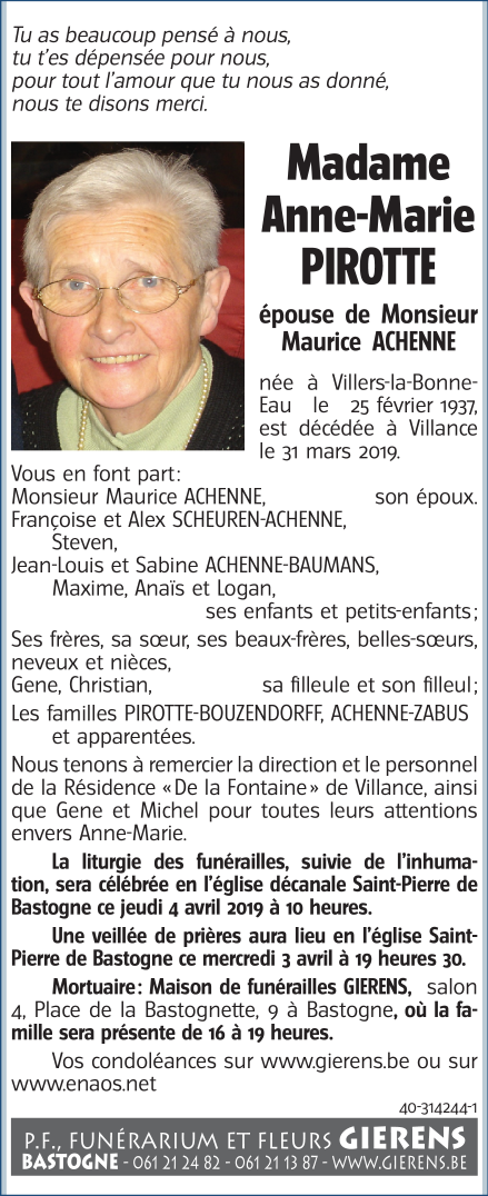 Décédée à Villance (6890) le dimanche 31 mars 2019 à l'âge de 82 ans