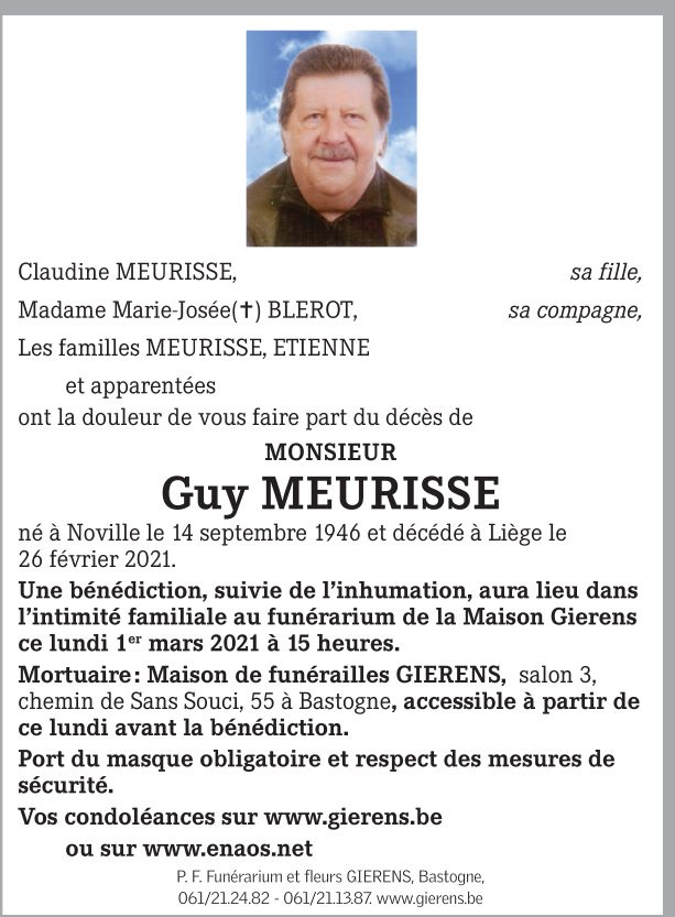 Décédé à Liège (4000) le vendredi 26 février 2021 à l'âge de 74 ans