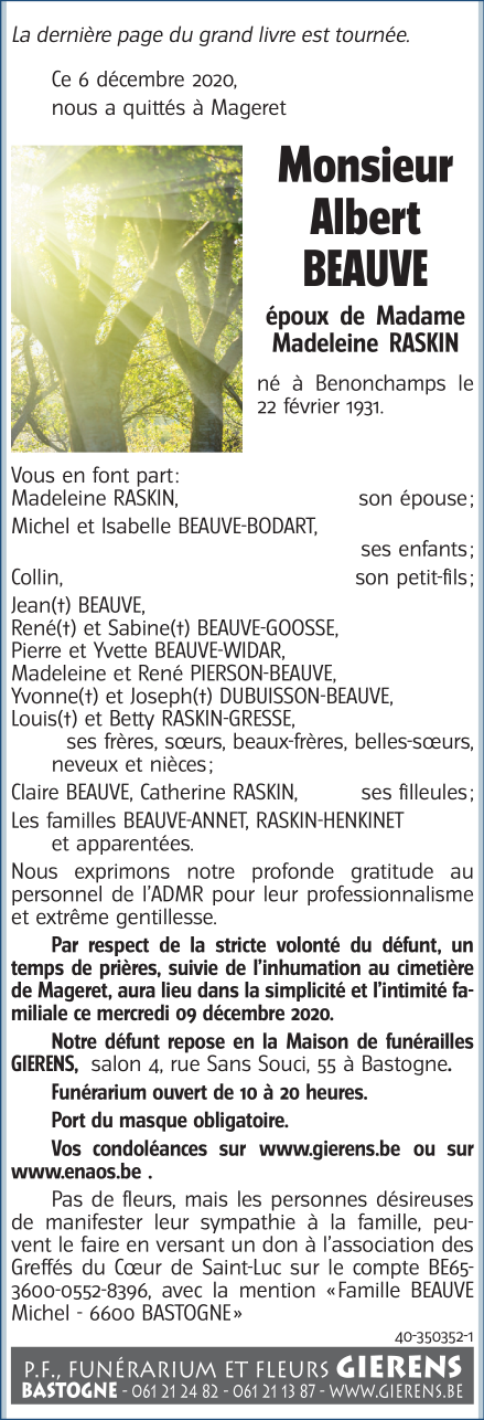 Décédé à Bastogne (6600) le dimanche 6 décembre 2020 à l'âge de 89 ans