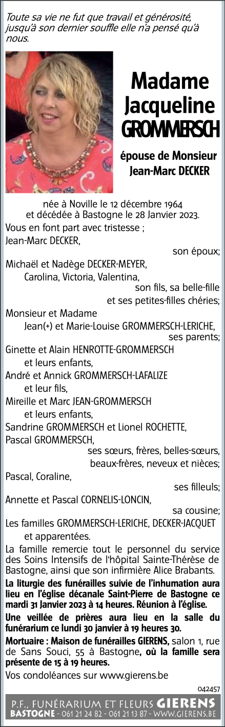 Décédée à Bastogne (6600) le samedi 28 janvier 2023 à l'âge de 58 ans