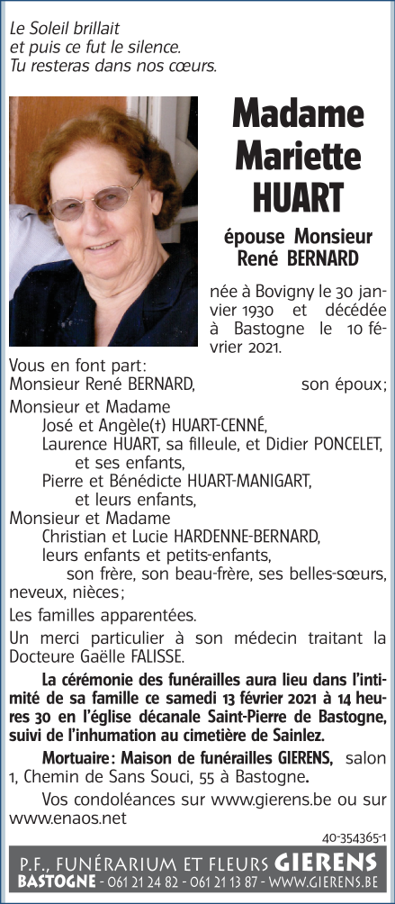 Décédée à Bastogne (6600) le mercredi 10 février 2021 à l'âge de 91 ans