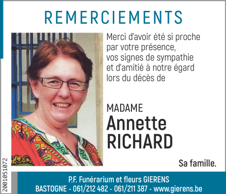 Décédée à Bastogne (6600) le jeudi 3 février 2022 à l'âge de 68 ans