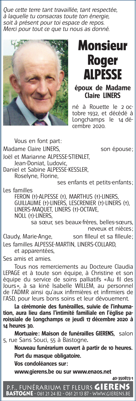 Décédé à Bertogne (6687) le lundi 14 décembre 2020 à l'âge de 88 ans