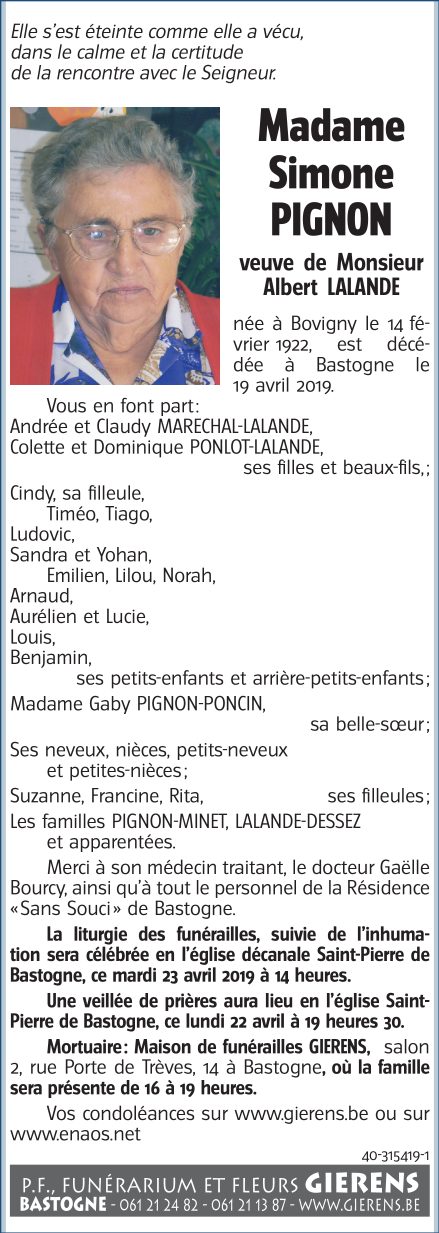Décédée à Bastogne (6600) le vendredi 19 avril 2019 à l'âge de 97 ans