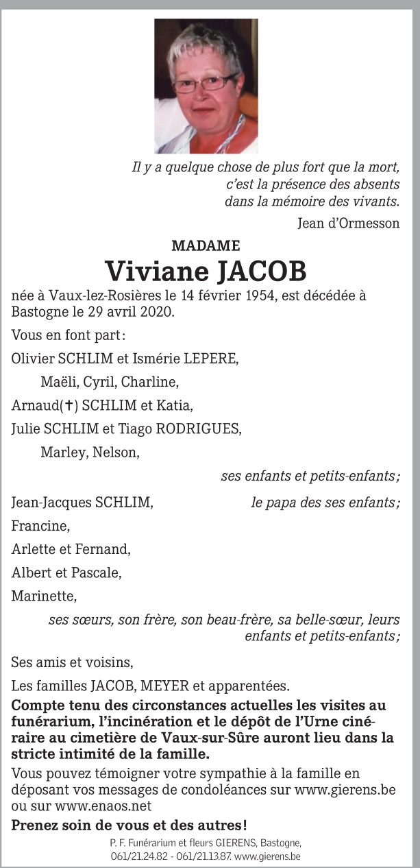 Décédée à Bastogne (6600) le mercredi 29 avril 2020 à l'âge de 66 ans