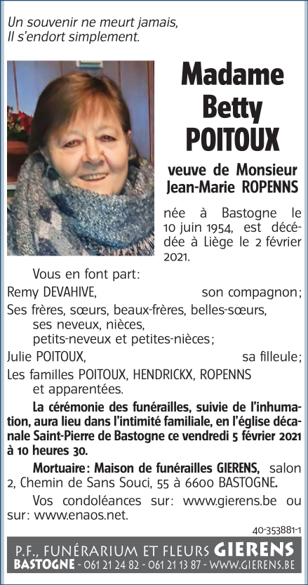 Décédée à Liège (4000) le mardi 2 février 2021 à l'âge de 66 ans