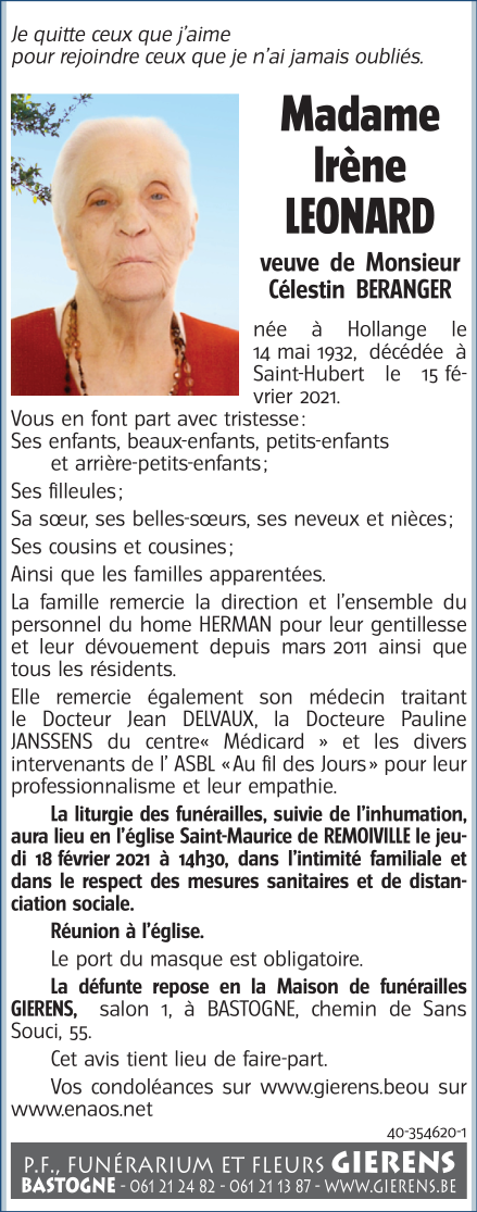 Décédée à Saint-Hubert (6870) le lundi 15 février 2021 à l'âge de 88 ans