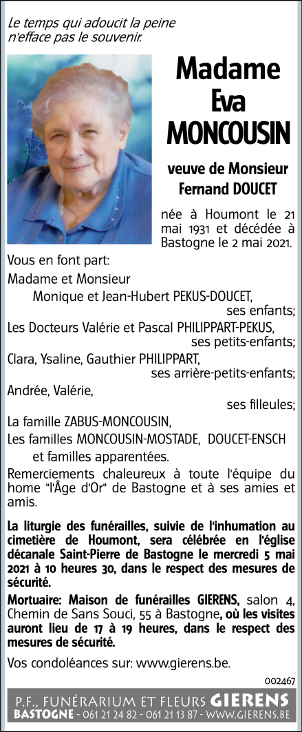 Décédée à Bastogne (6600) le dimanche 2 mai 2021 à l'âge de 89 ans