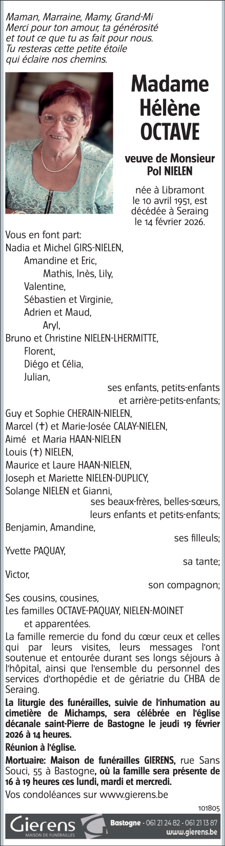 Décédée à Seraing (4100) le samedi 14 février 2026 à l'âge de 74 ans