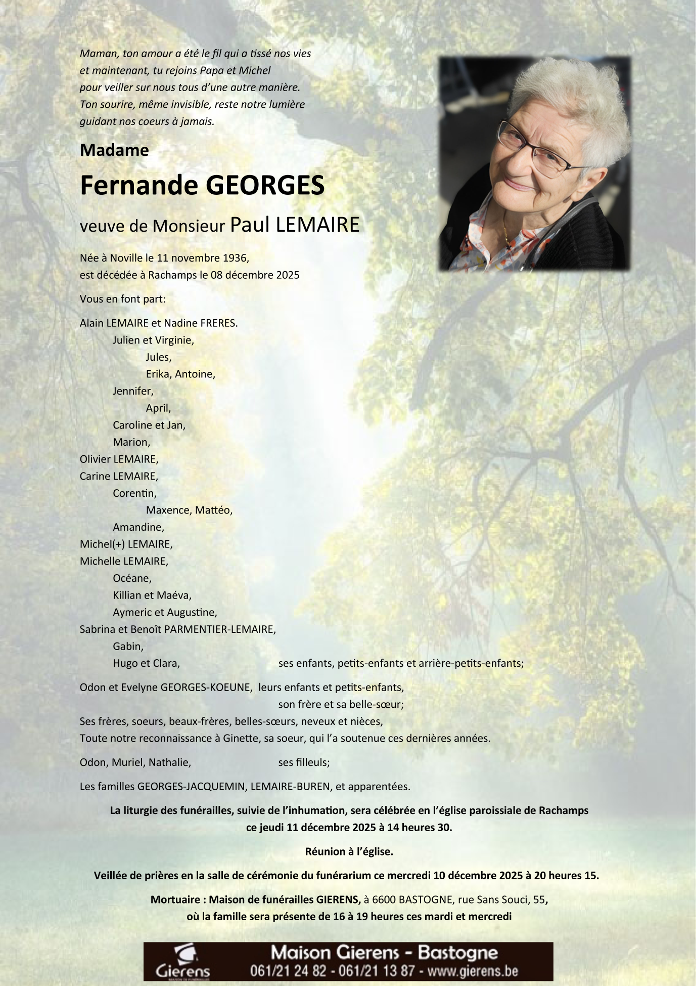 Décédée à Bastogne (6600) le lundi 8 décembre 2025 à l'âge de 89 ans