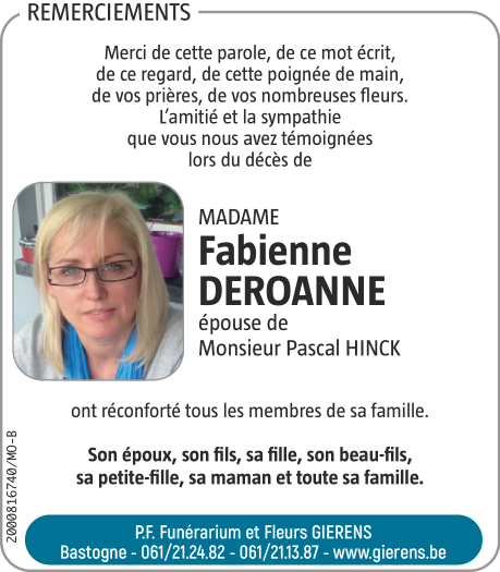 Décédée à Bastogne (6600) le samedi 10 avril 2021 à l'âge de 53 ans