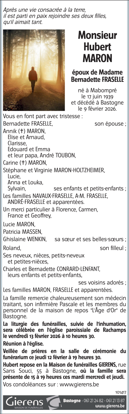 Décédé à Bastogne (6600) le lundi 9 février 2026 à l'âge de 86 ans