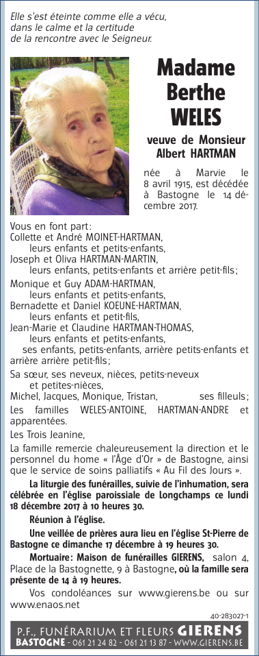 Décédée à Bastogne (6600) le jeudi 14 décembre 2017 à l'âge de 102 ans