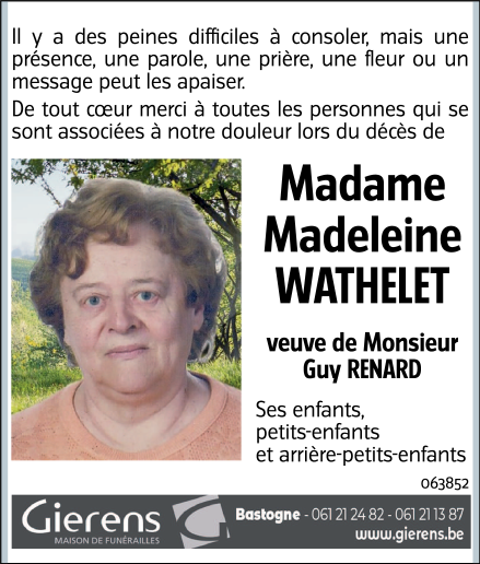 Décédée à Bastogne (6600) le lundi 8 janvier 2024 à l'âge de 90 ans