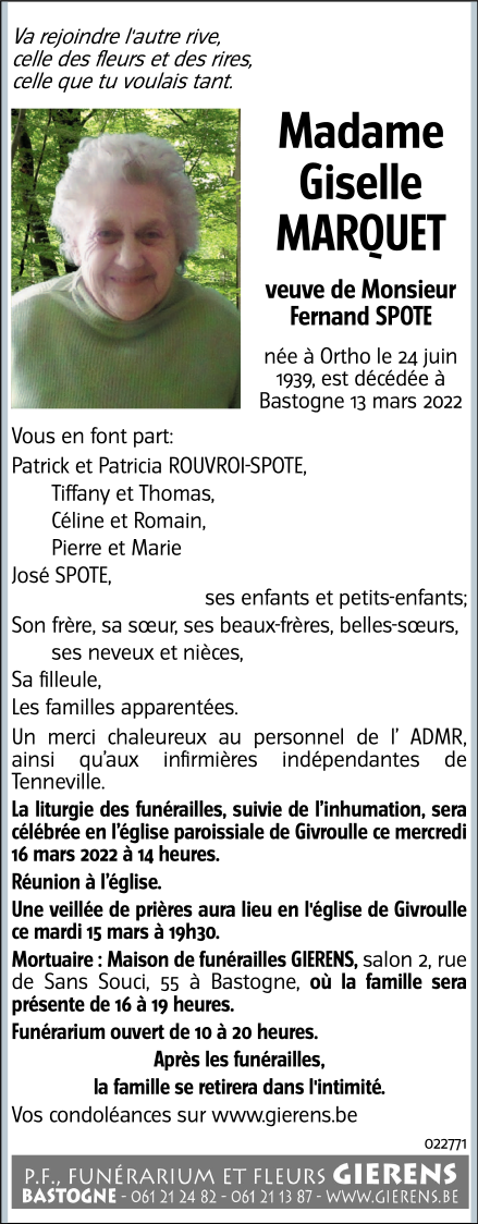 Décédée à Bastogne (6600) le dimanche 13 mars 2022 à l'âge de 82 ans