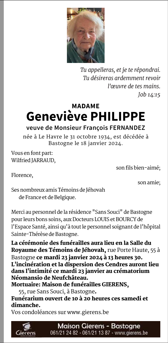 Décédée à Bastogne (6600) le jeudi 18 janvier 2024 à l'âge de 89 ans