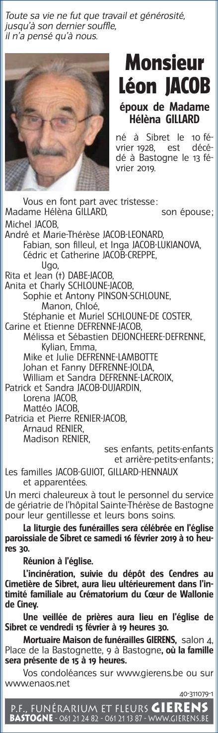 Décédé à Bastogne (6600) le mercredi 13 février 2019 à l'âge de 91 ans