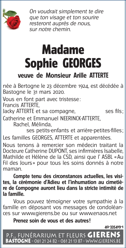 Décédée à Bastogne (6600) le mardi 31 mars 2020 à l'âge de 95 ans