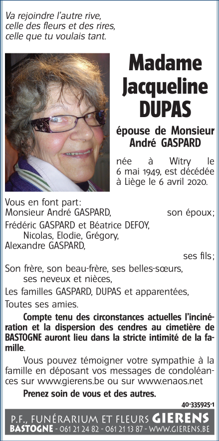 Décédée à Liège (4000) le lundi 6 avril 2020 à l'âge de 70 ans
