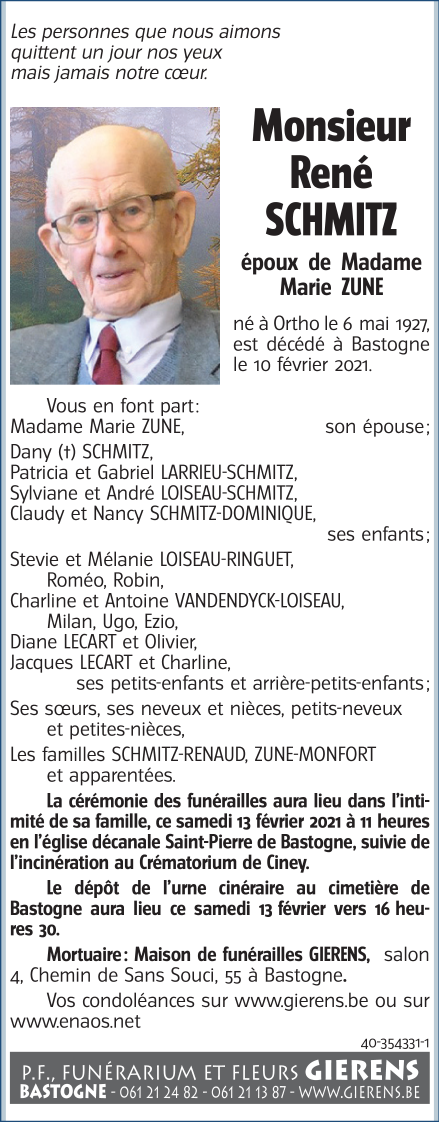 Décédé à Bastogne (6600) le mercredi 10 février 2021 à l'âge de 93 ans
