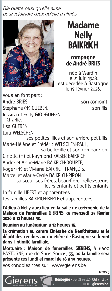 Décédée à Bastogne (6600) le jeudi 19 février 2026 à l'âge de 77 ans